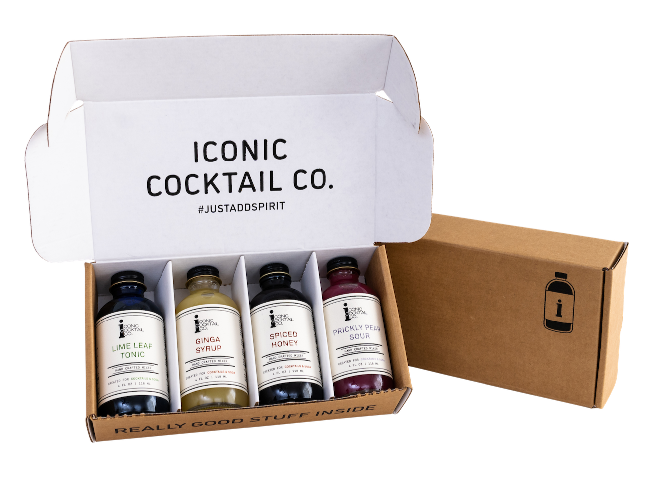 Mini Mixer Packs come in a kraft box with our four Signature Flavors (Lime Leaf Tonic, Ginga Syrup, Spiced Honey, and Prickly Pear Sour). These packs include recipe cards for each flavor.